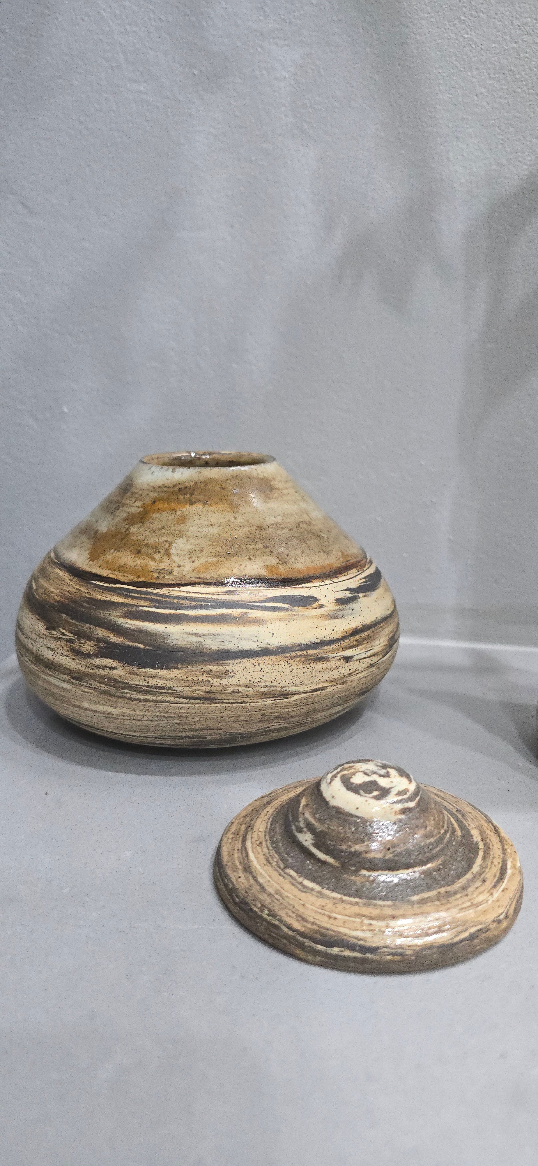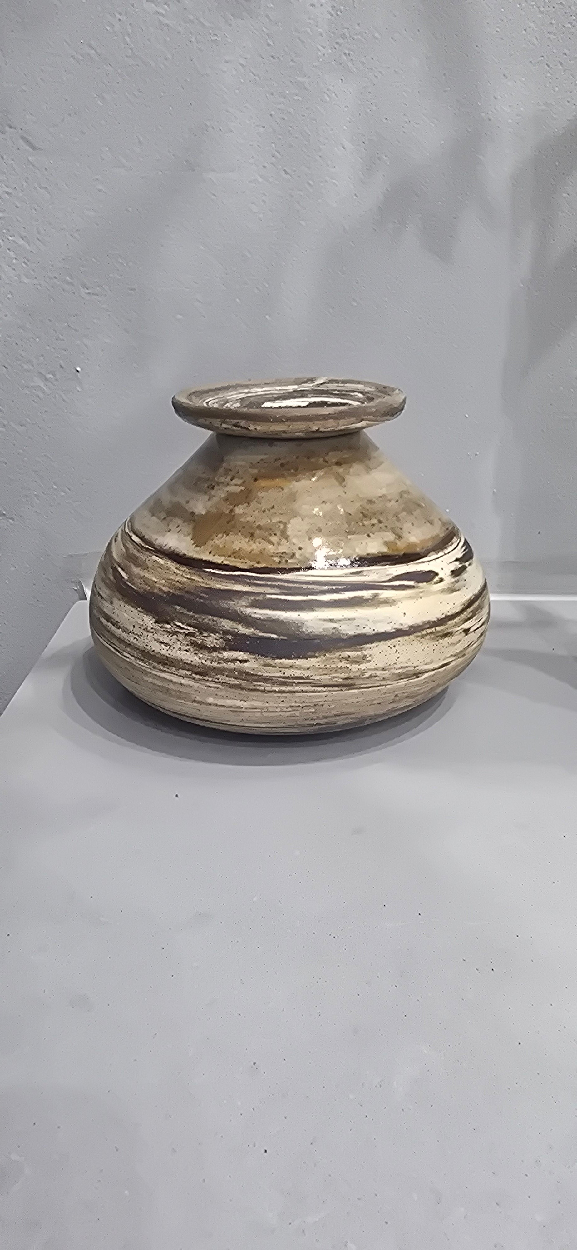 Vasija Marmoleada realizada con cuatro barros diferentes de alta temperatura con un esmalte honey flux en el cuello de la vasija dejando al descubierto el efecto marmoleado creado en el barro. En su interior se le aplico esmalte transparente.
